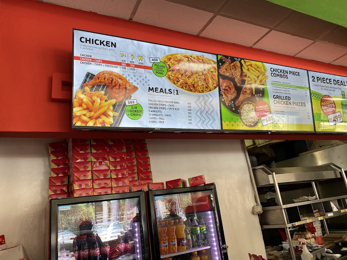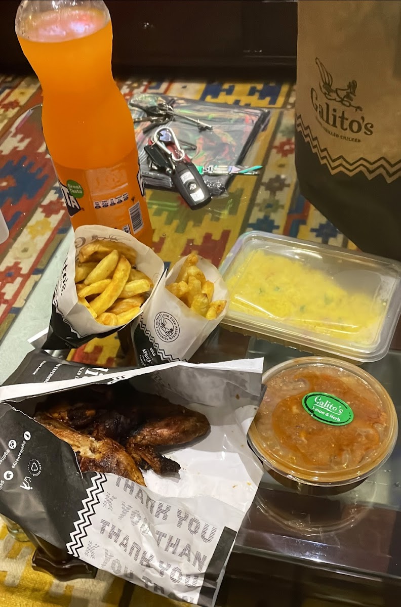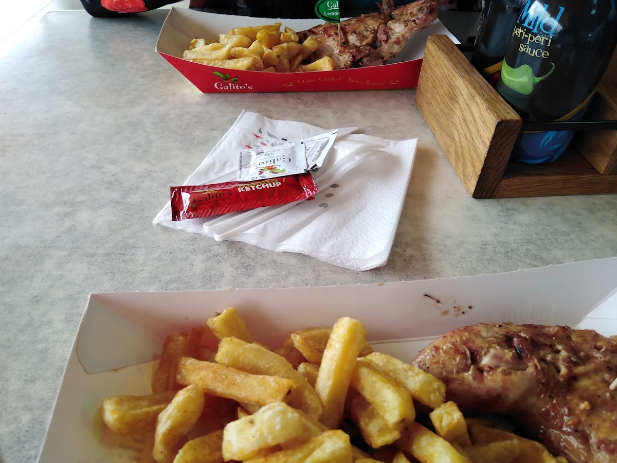 The interesting thing about Galitos is that operating hours are till late. Food is fresh and there are satisfactory in size and taste. The ambience is usual as every fast food outlet. Large lit up menus above the counters .. 3 tills with only 2 till attendants. Service with a smile and near 11pm to midnight drunk youths arrive, and the place smells like a bar from their breathe. . There is a convenience store which sells everything and the alcohol is very pricey, ATM services and a pharmacyall in one huge Rubis service station.. Pizza in and creamy Inn for the ice cream lovers . The flavours are restricted, but the cones and cups are decent. Back to GALITOS food. Good size portions, delivery services available including the very unpredictable GLOVO...DAD is galitos deliver services. Chips / Fries are portioned from small to X large. My favourite is the family meal with the buns and salad. Lemon and herb to HOT are the chicken flavours, and the new liver and rice is a nice delicious meal . Rating 8/10 for me. Clean place to eat as the tables are cleaned regularly. Order a delivery or eat at Galitos Valley Arcade tables you are good.